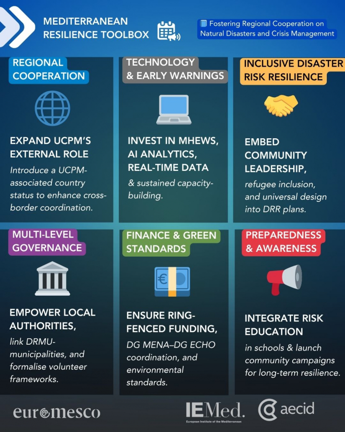 Ultimately, the study argues that regional cooperation, technological innovation, and inclusive governance are essential to safeguarding communities and achieving long-term resilience. It calls for a renewed EU–Southern Neighbourhood partnership, leveraging mechanisms like the UCPM and the Pact for the Mediterranean to build a more cohesive and people-centred approach to crisis management.