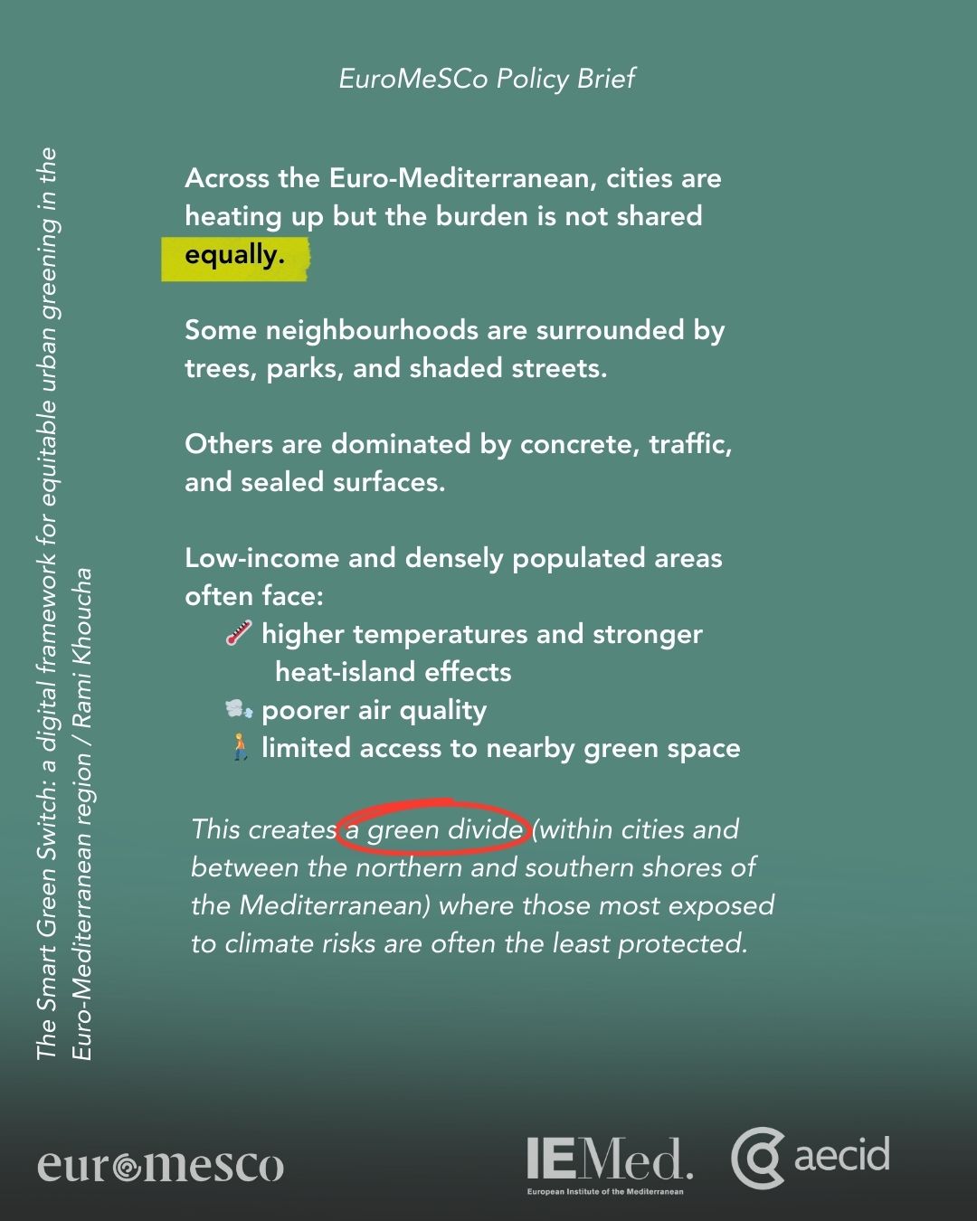 This Policy Brief examines how urban greening in the Euro-Mediterranean region continues to be shaped by structural inequities and weak planning frameworks, where low-income neighbourhoods and cities bear the brunt of heat, pollution, and limited access to green space. While municipalities invest in tree-planting and green infrastructure, many initiatives remain reactive, driven by land availability rather than environmental or social need, and often exclude community input.